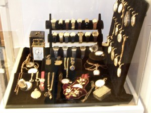This collection of personal timepieces reflects the changes in utility and fashion from the early nineteenth century to mid-twentieth century. The watches shown top row of the tiered display date from the 1940s to 1050s, the second row from the 1960s to 1970s, and the bottom tier from the 1980s to 1990s. The carriage clock and case, used for traveling, and the watch “slipper” date from the 1800s.